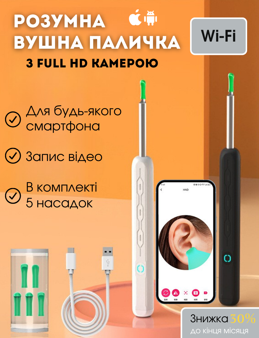 Електронна вухочистка підключається до смартфону через Wi-Fi і підходить як для Android, так і для iOS. Це робить її зручним та багатофункціональним пристроєм.